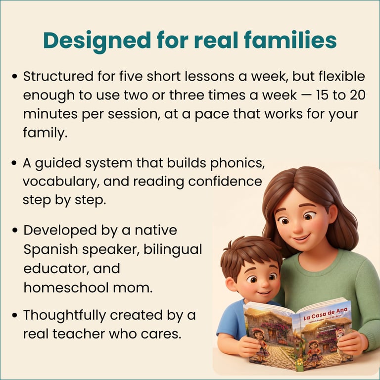 A structured Spanish reading program for homeschool families, designed to build real biliteracy through stories children can understand and enjoy.